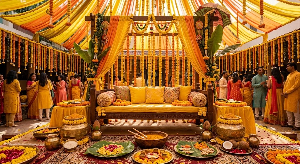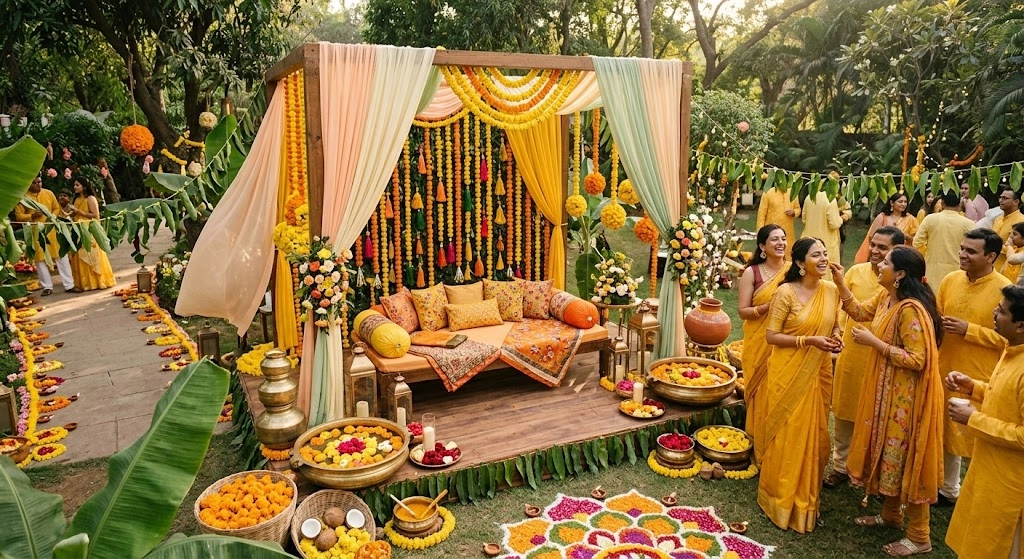 A Haldi celebration is full of warmth, colour, emotion, and ritual, which makes décor especially important. The space should feel bright and festive..