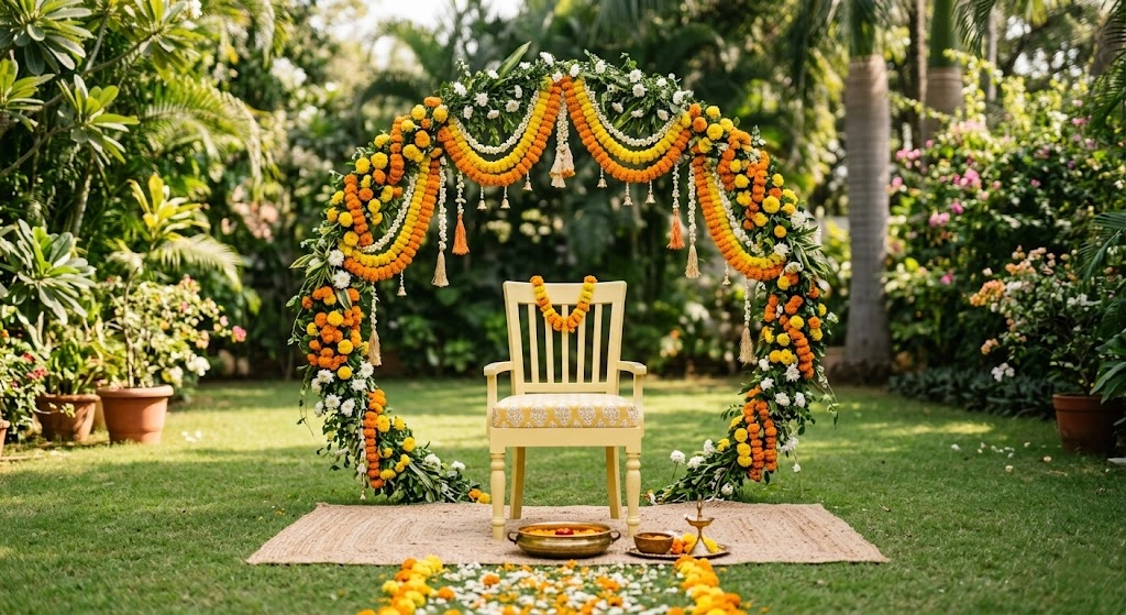 Yellow is the emotional heart of Haldi décor. It instantly brings warmth, ritual familiarity, and festive brightness into the celebration, which is why yellow-led Haldi..
